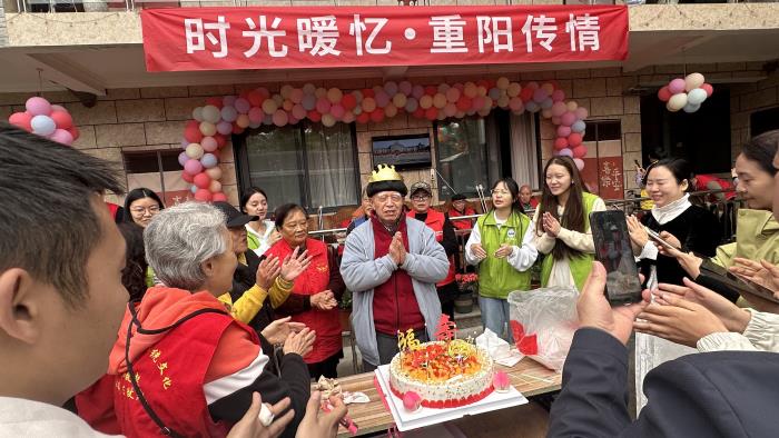 表演结束后,全体人员合影定格美好瞬间。活动特别为养老院李泽勇老先生筹备了八十大寿仪式——志愿者推着定制生日蛋糕缓缓走向舞台,全场齐唱生日歌,李老先生在众人的祝福中吹灭蜡烛、许下心愿,随后与志愿者共同切分蛋糕、分享喜悦。老人眼角的笑意与现场的掌声交织,成为本次活动最动人的温情时刻。